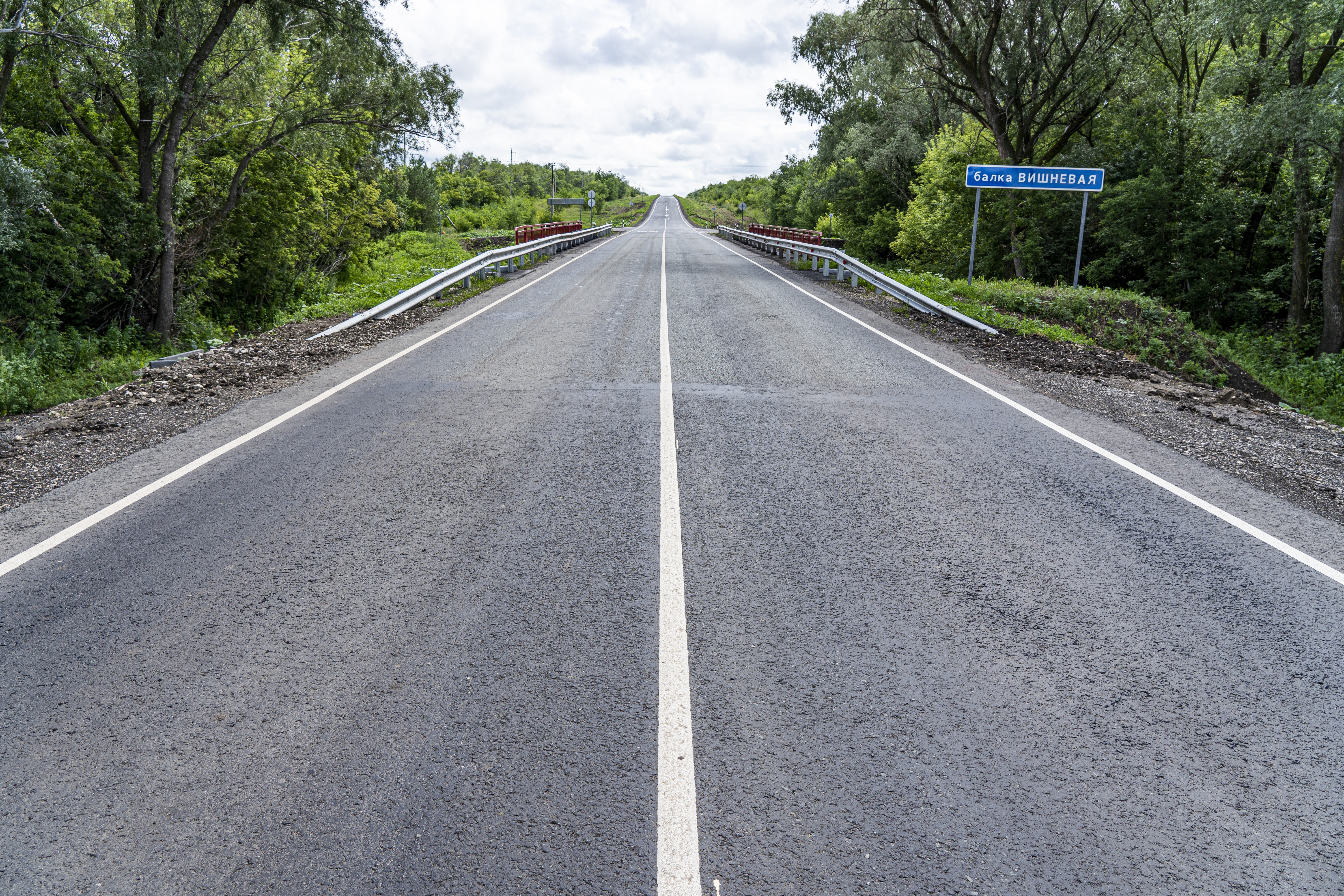 В этом году подрядчик уложил верхний слой дорожного покрытия, укрепил обочины, установил барьерное и пешеходное ограждения, нанес разметку термопластиком.